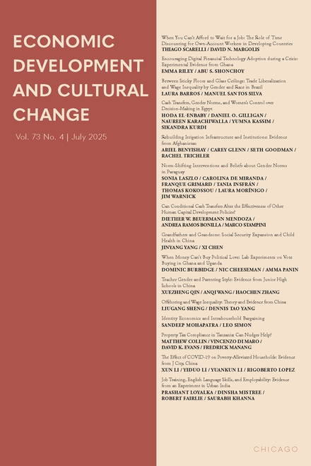 Economic Development and Cultural Change (EDCC) publishes studies that use modern theoretical and empirical approaches to examine both the determinants and the effects of various dimensions of economic development and cultural change. EDCC’s focus is on empirical papers with analytic underpinnings, concentrating on microlevel evidence, that use appropriate data to test theoretical models and explore policy impacts related to economic development.