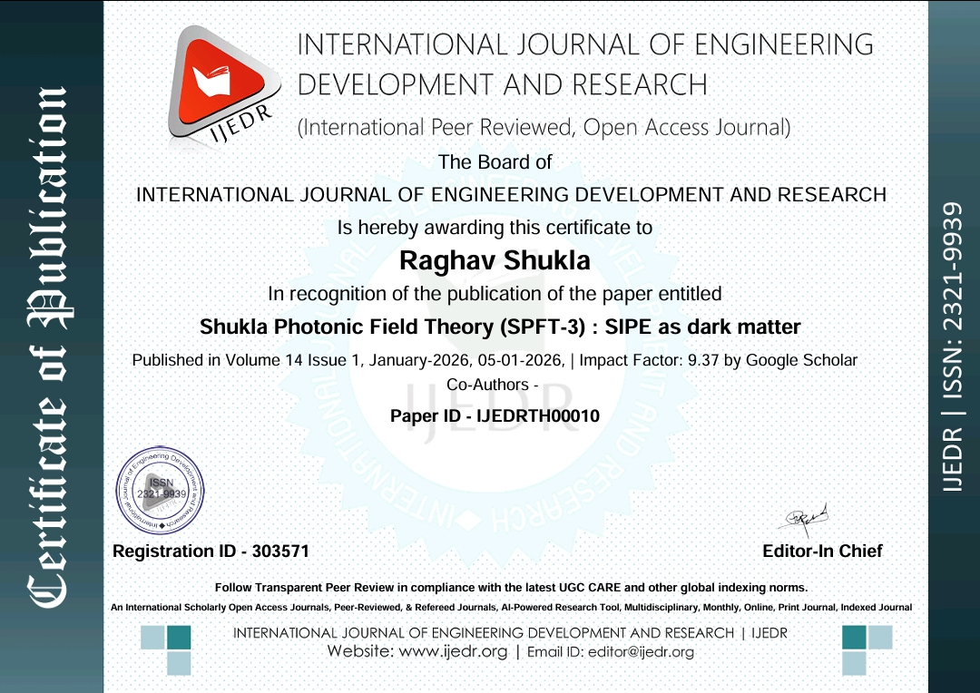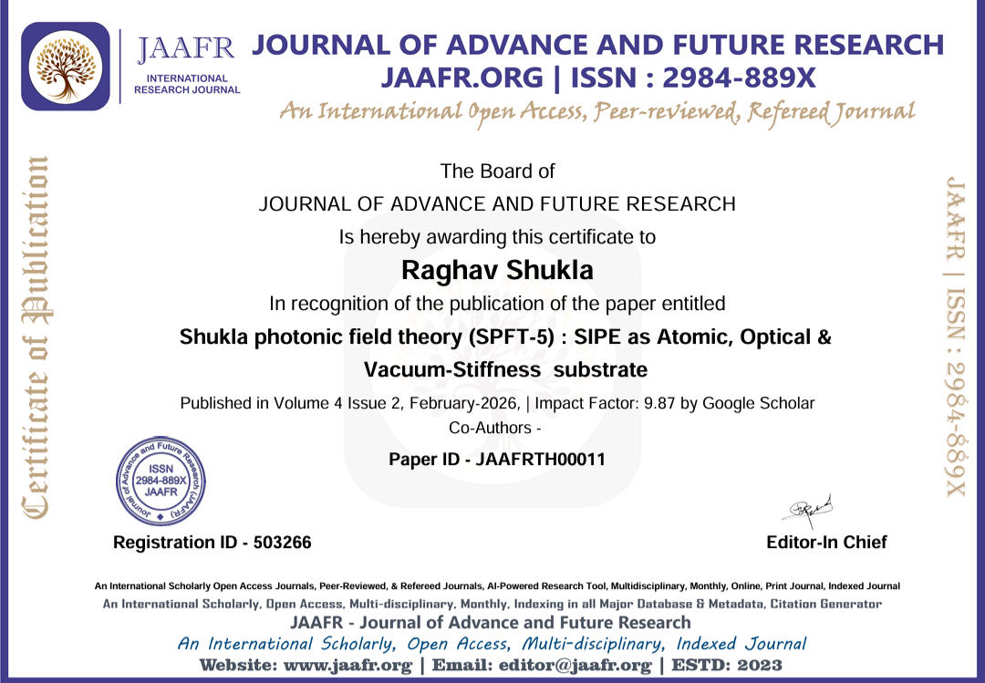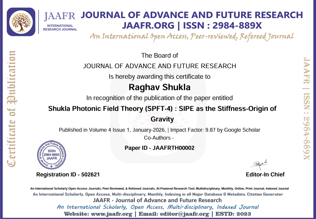 “Raghav Shukla is an independent researcher working at the intersection of physics, cosmology, astrophysics Indian philosophy, and history of India.he is a lecturer of physics . He has published research on shukla photonic field theory SPFT series,solar magnetism (SSMD Theory), SSMD 2nd PROTO SUN ORIGIN magnetic Seed, shukla sun disk evolution theory(SSDE), shukla gas rock theory (SGRT),in philosophy energy-philosophy (Atman as bound energy, Brahman as free energy), archaeologcal research on kushan kalin shivling,siddh baba shivling and Indian cultural traditions. His aim is to integrate modern scientific perspectives with ancient wisdom.”