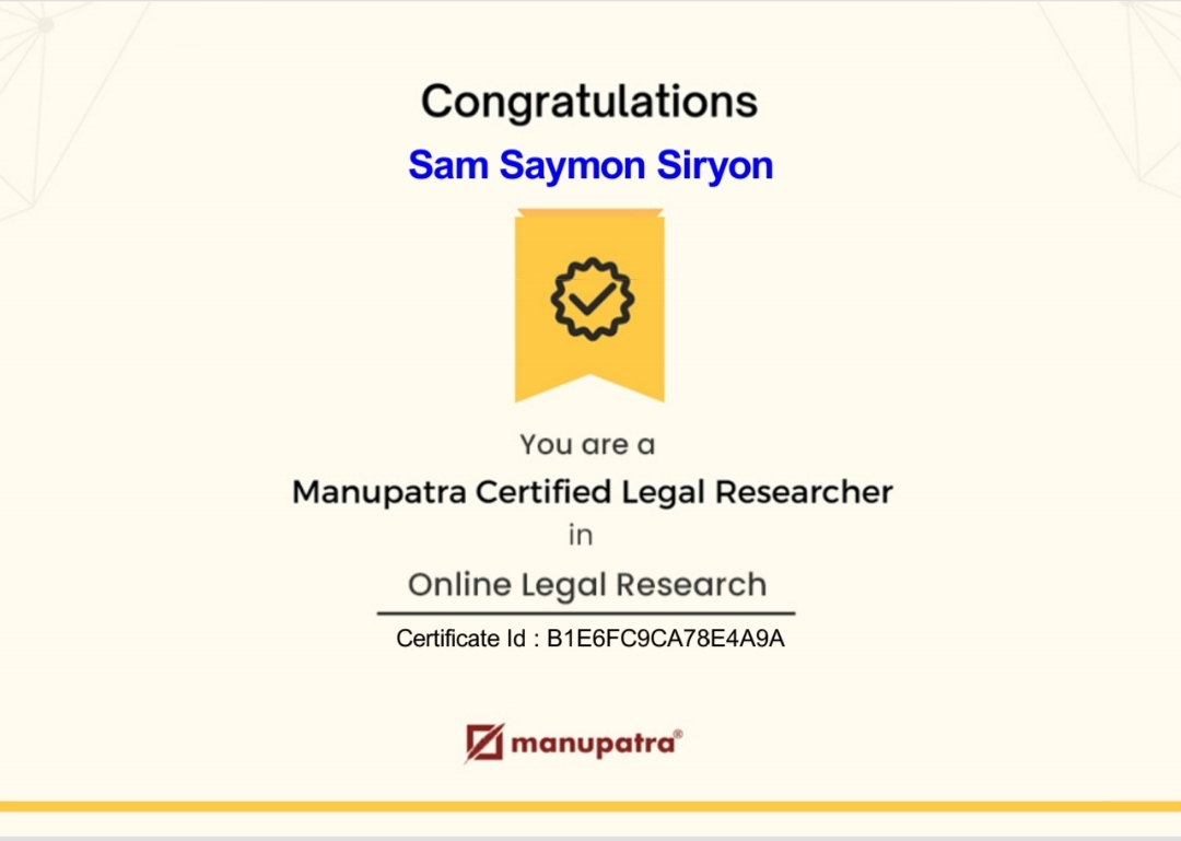 I underwent a six-months virtual course offered by India's most extensive legal database and completed the mandatory assessment thereby qualifying me as a Certified Legal Researcher. Capable of navigating advanced websites, complex legal statutes and texts, as well as decoding landmark judgements.